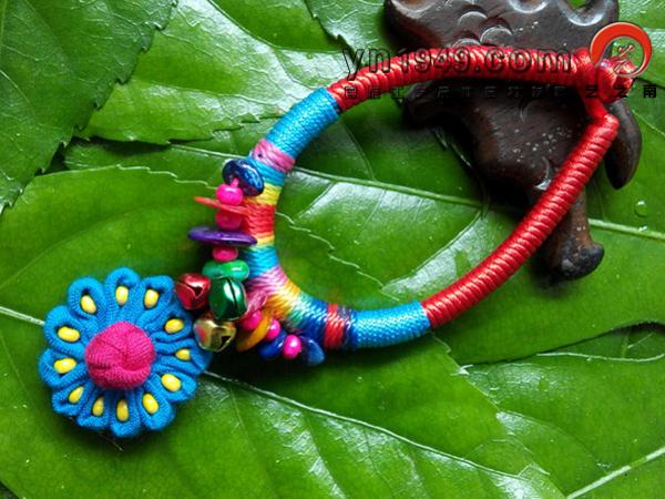 材料:手编彩线、布艺花朵、彩石、铃铛、木珠