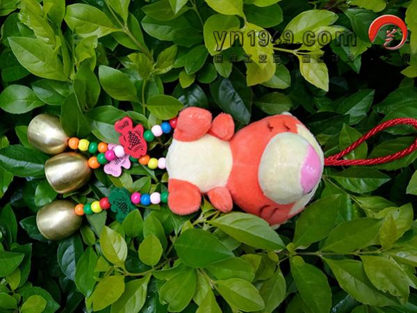 材料:绒布、彩色木珠、彩色木片、3个铜铃