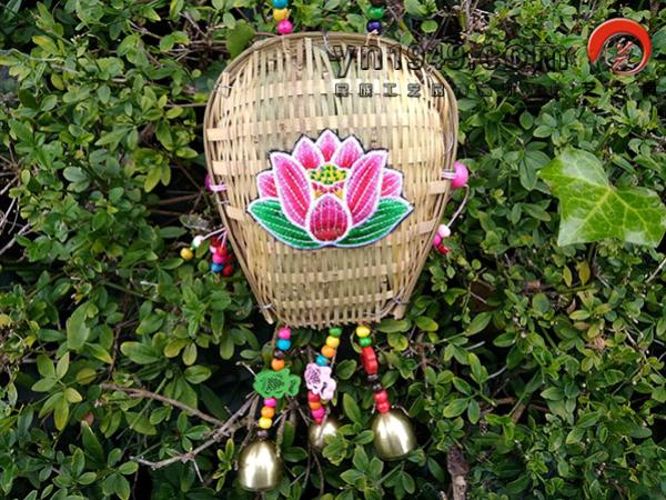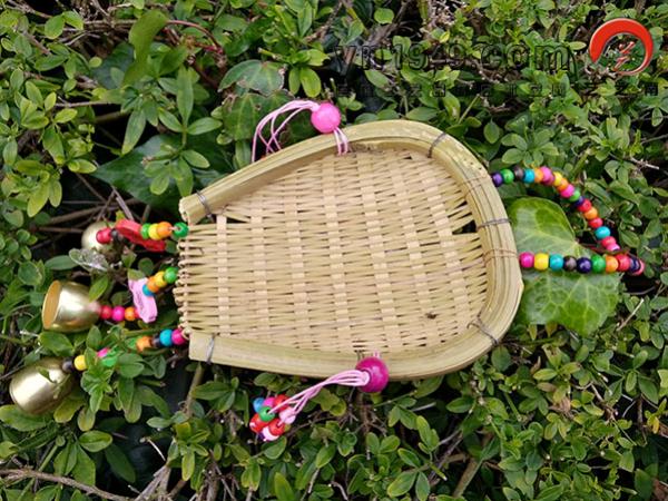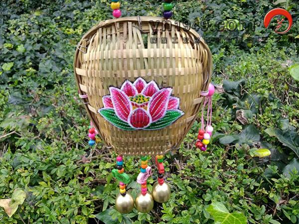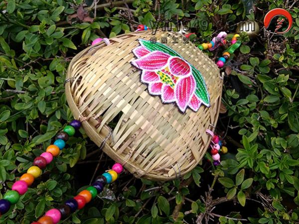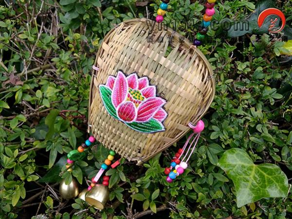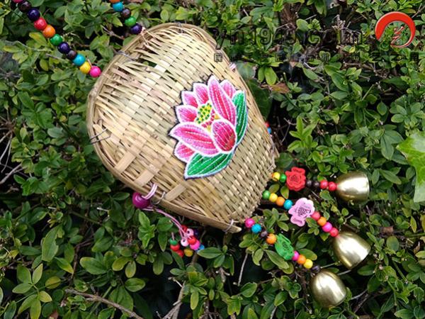 材料:手编筲箕、3个铜铃、彩色木珠、彩色木片、绣花