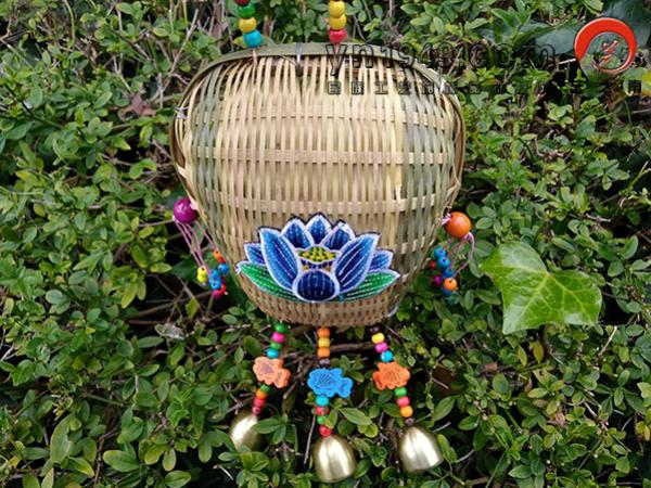 材料:手编筲箕、3个铜铃、彩色木珠、彩色木片、绣花