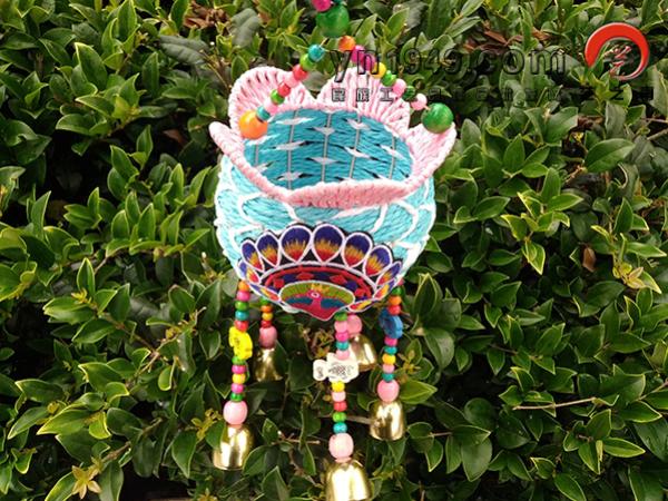 材料:草编铁篮、5个铜铃、绣花、彩色木珠、彩色木片